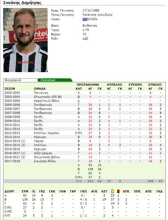 Το soccerbase.gr έχει καταγράψει μια μια τις παρουσίες του και σας παρουσιάζει την καριέρα του με αριθμούς από το 2003 ως σήμερα, που αγωνίστηκε στις Εθνικές κατηγορίες.
